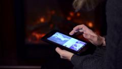 Описание: Women uses tablet near fireplace