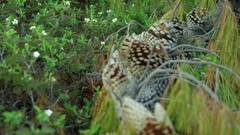 Описание: Pinecones lie on the grass, black caterpillar creeps on the branch of pine, small white flowers bloom in the forest, statics, blurring, 4K