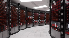 Описание: Modern working server room with rack servers. Cloud computing in datacenter, information storage. Server error with red indicators. Seamless, looping element