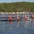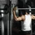 Description: Side view of man which using rowing machine in gym.