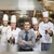 Description: Positive cooks in process of working in kitchen of restaurant