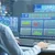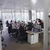 Description: In a large office, a team of traders examines infographic data about the market position.