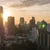 Description: Drone panning around Perth city skyline at sunrise with light rising over the hills of Western Australia
