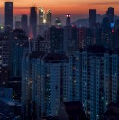 Cinematic Urban Aerial Of Chinese City At Night.