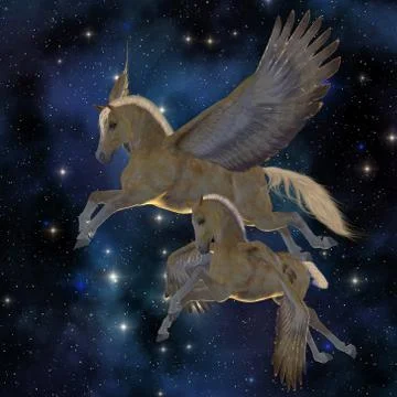 (49)Pegasus (Ancient Greek: Πήγασος, Pḗgasos; Latin: Pegasus, Pegasos) is one of the best known creatures in Greek mythology. He is a winged divine stallion usually depicted as pure white in color. He was sired by Poseidon, in his role as horse-god, and foaled by the Gorgon Medusa. (Wiki)